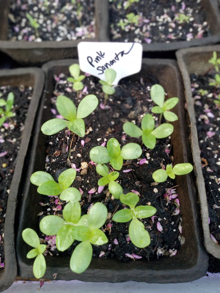 The cosmos have the most failures. A variety called “Double Click” has four seedlings. A marigold heirloom from Sweden called “Burning Embers” never showed at at all. I will have to get seeds from my sister, whose expatriate Dutch friend has a similar variety.