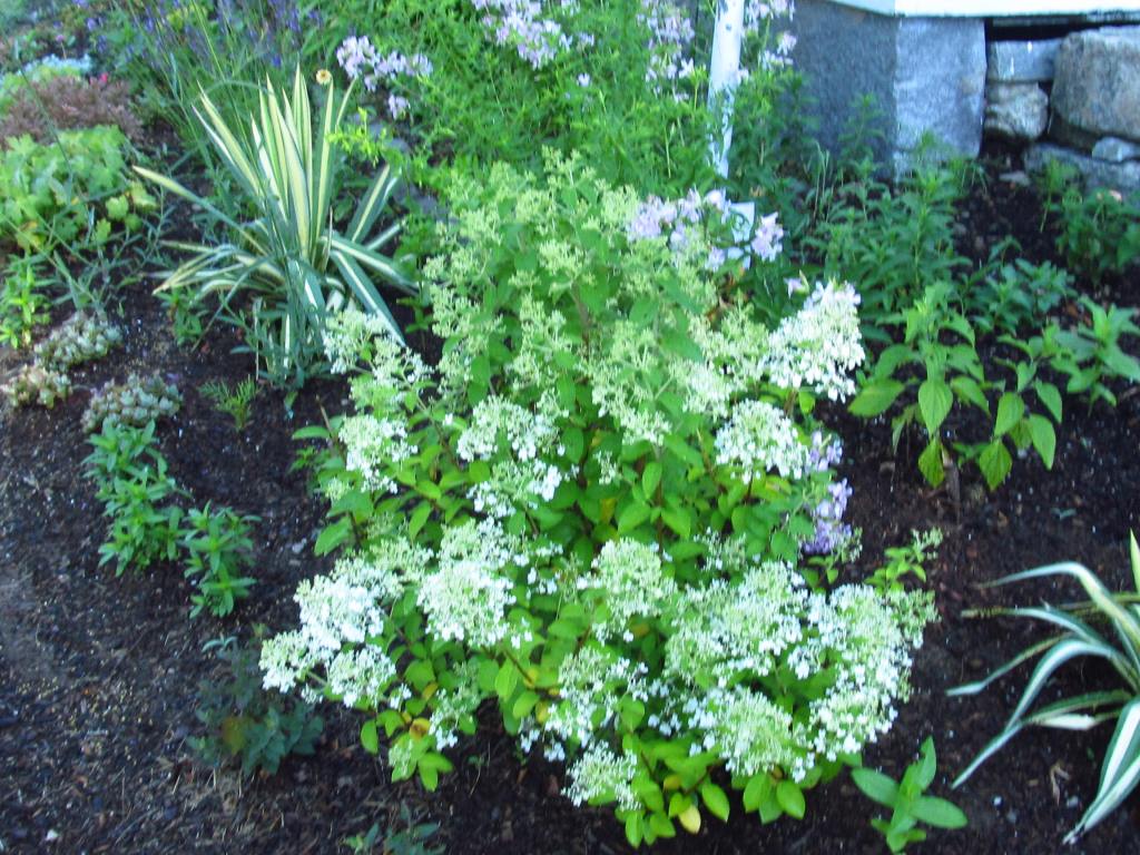 PG Hydrangeas are the Crape Myrtles of southern New Hampshire. They are everywhere, and most are large. This is the dwarf “Bobo”. A larger shrub would have been out of scale for this small flower bed.