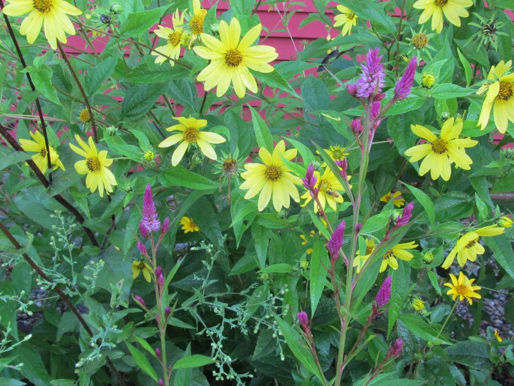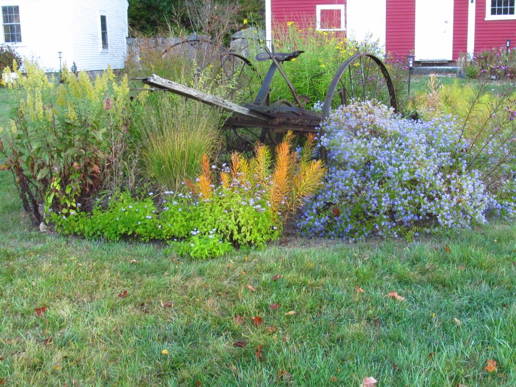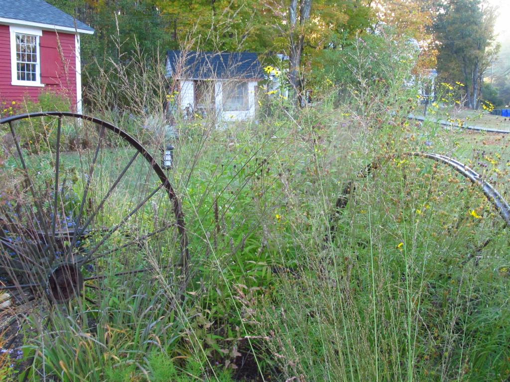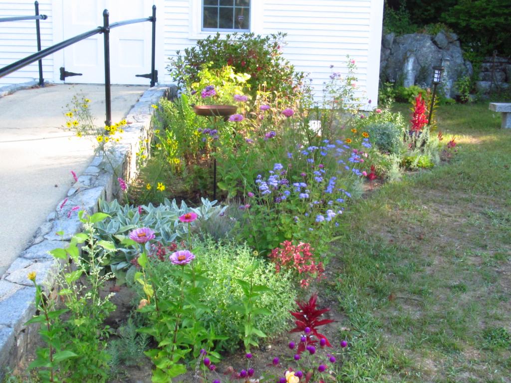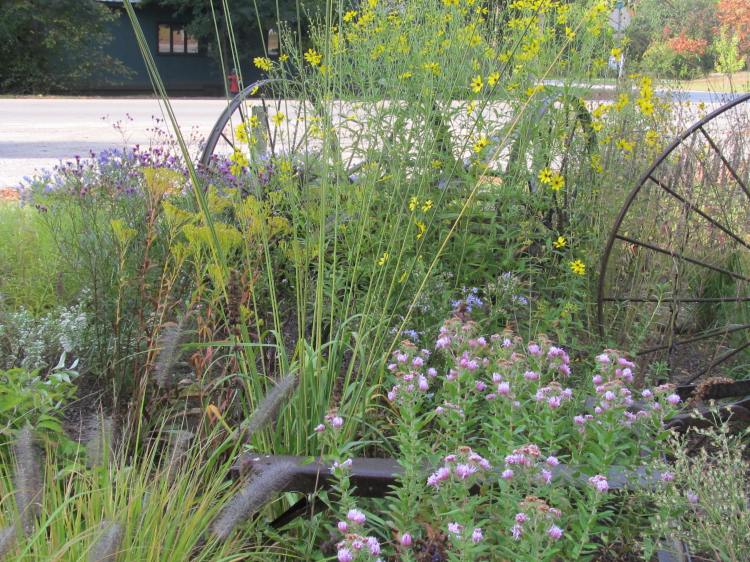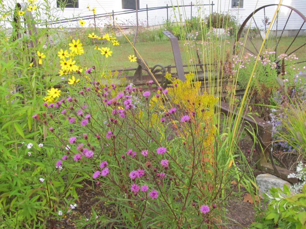 I planted all perennials in the Meadow Garden, but did include some non-native grasses. Despite the heat and drought it was watered only a handful of times. It bloomed in late summer and included goldenrods, asters, ironweeds, and the showy butterscotch fall leaves of the spring blooming amsonias. This garden bed is only three years old, but it has filled in so fully that I will need to divide many of the plants. Some of the divisions will be going to the Baker Free Library in Bow NH, which is renovating its pollinator gardens.