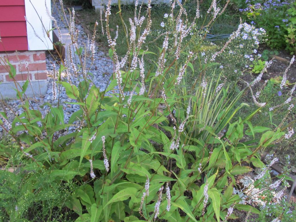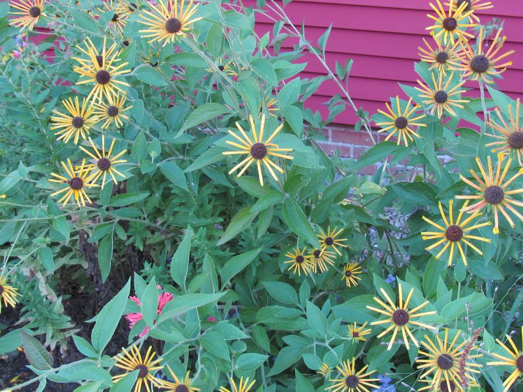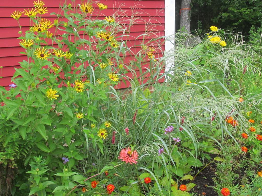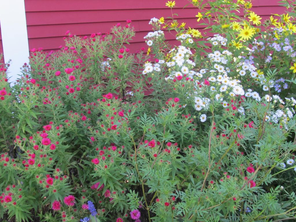 The garden I call “The Sandpit” lies facing east and is backed by a tall retaining wall of granite boulders. The soil is that of a blueberry barrens. Sandy and infertile, any hose water or rain runs down to Gregg Mill Pond, that is if any is left by the hundred plus year old maples. It is harsh terrain, and some might wonder what plants could even grow there. Yet here it is in the past few days, visited by migrating monarchs and hungry bees.