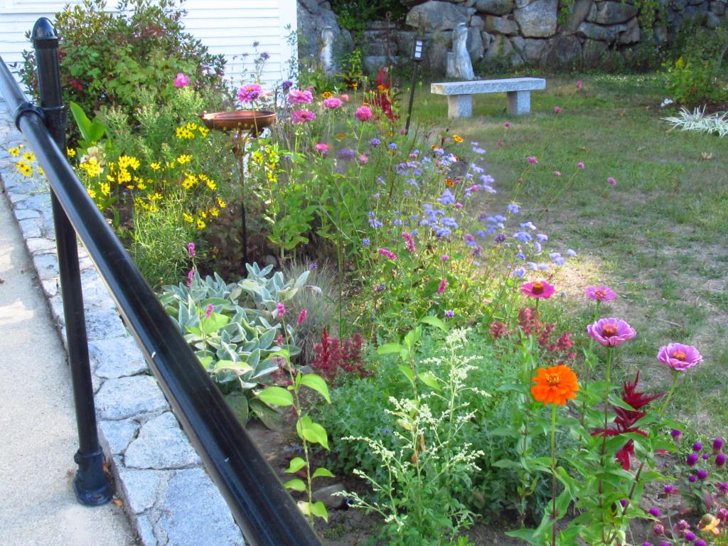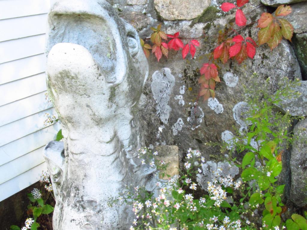 This is a small garden bed in the Goffstown Historical Society Gardens. The stone birds or frogs or gargoyles came from a building in Goffstown, where they peered down at Mast Road while dutifully diverting rain off the roof. Now they sit along beneath a retaining wall beside abandoned stone steps.