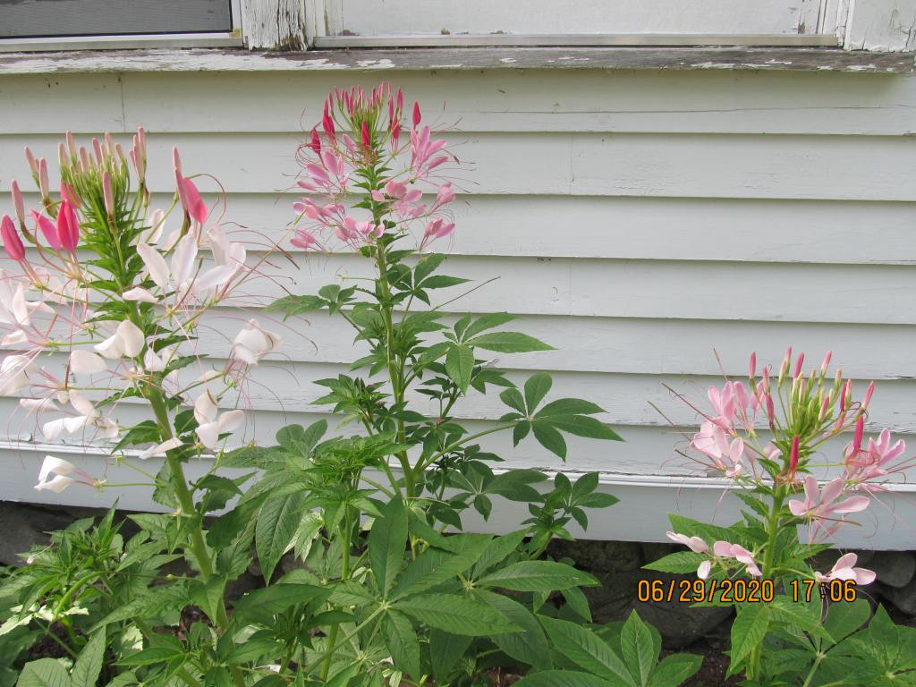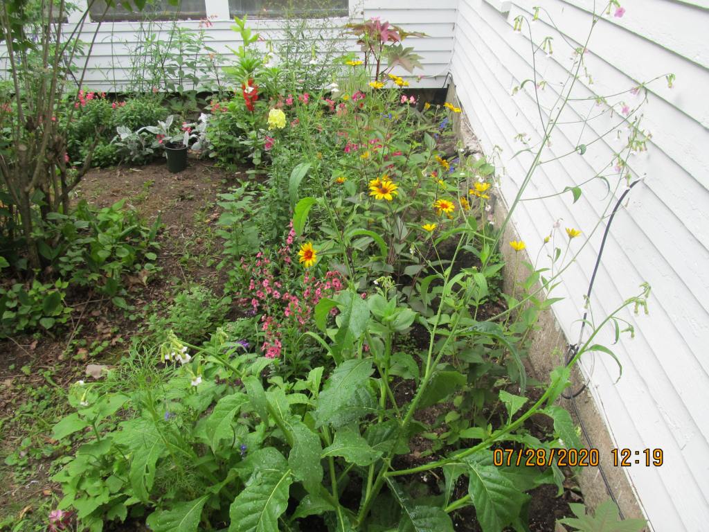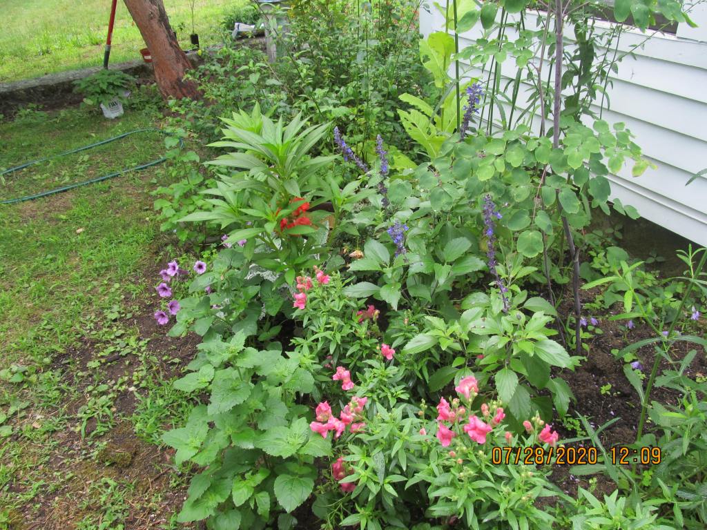 When we were at 100 degrees a few days ago, my balsams fell over, the cleomes shed yellow leaves, and misery was everywhere, except in this part of the garden.