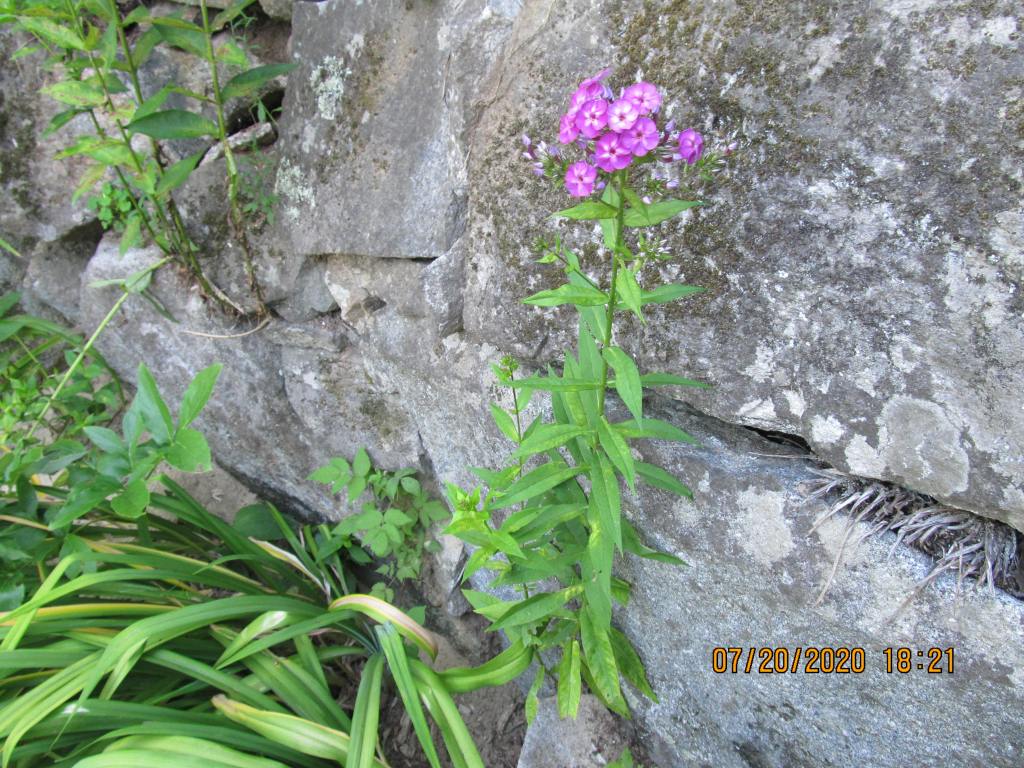 These next photos are of the dry garden and the hanging garden of volunteer phlox that sprout in the granite wall. The soil here is sand. When I decided to put a garden bed in such inhospitable ground I had the local inhabitants show me the way. There were several large stands of Oenethera biennis, various dry field goldenrods, wild black eyed susans, aster lateriflorums, heath asters, feral daylilies, and the spotted St.John’s wort.