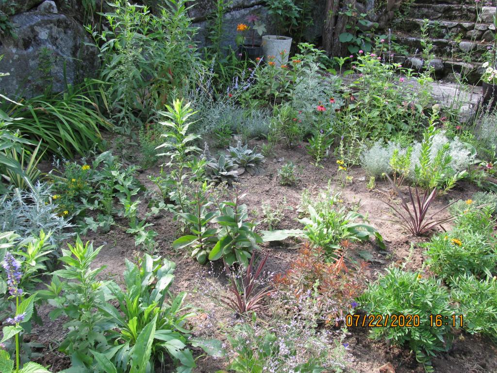 In the following photo, if you look closely at the middle of the rock wall behind the dry garden, you will see a pile of sand and part of a wooden handle belonging to an edger I shoved into a woodchuck hole. I packed around the handle with the spiny corpse of the sea holly “Little Hobbit”, a plant I will not miss.( In my vegetable garden I shoved a pitchfork into a wall the woodchucks came through).