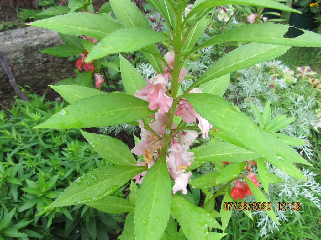 Closeups of Balsams. These are easy to grow from seed, and would be a good starter seed for a child to plant. They are an heirloom annual and a form of Impatiens. Let them dry out and they faint into a heap. These self sowed throughout a rock wall in a Nashville garden I cared for.