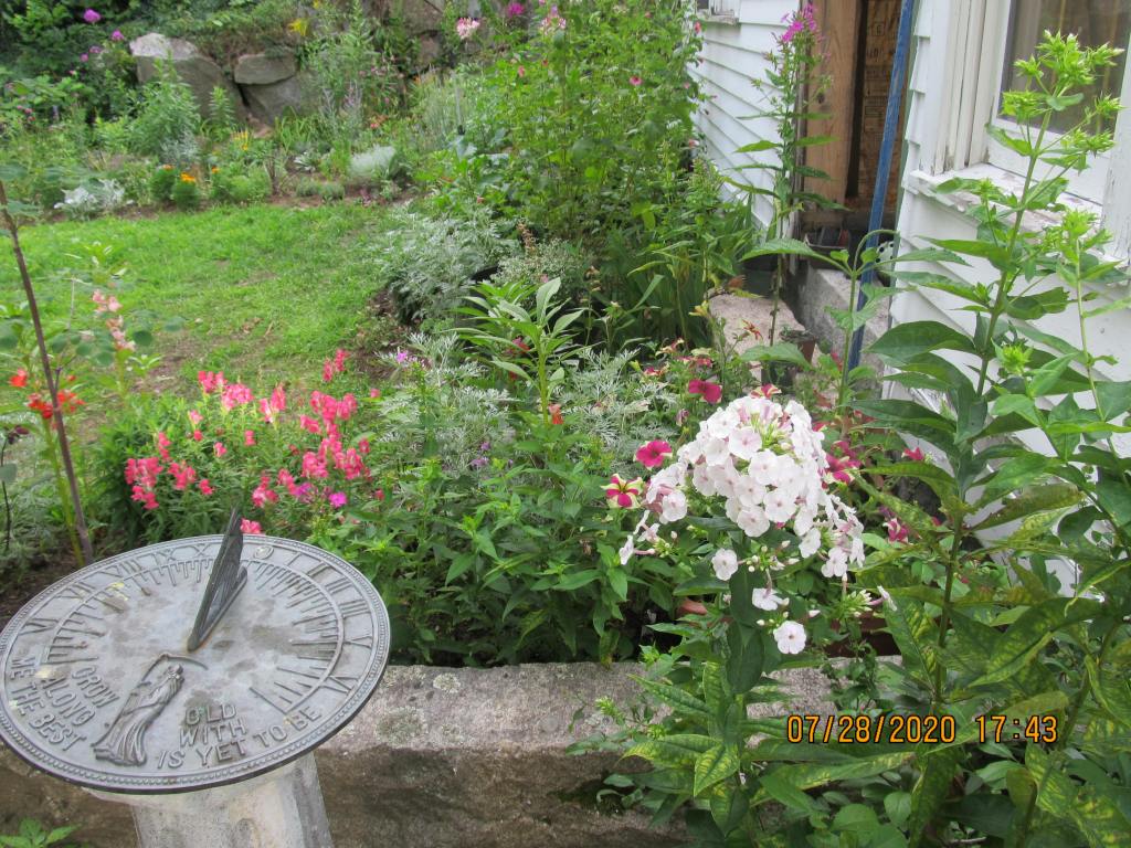 This is another of the survivor phloxes growing in the dooryard. It has some leaf yellowing, but no mildew. This photo was taken this evening, and it shows how eye catching white flowers can be In the distance, the gray plants light the garden.