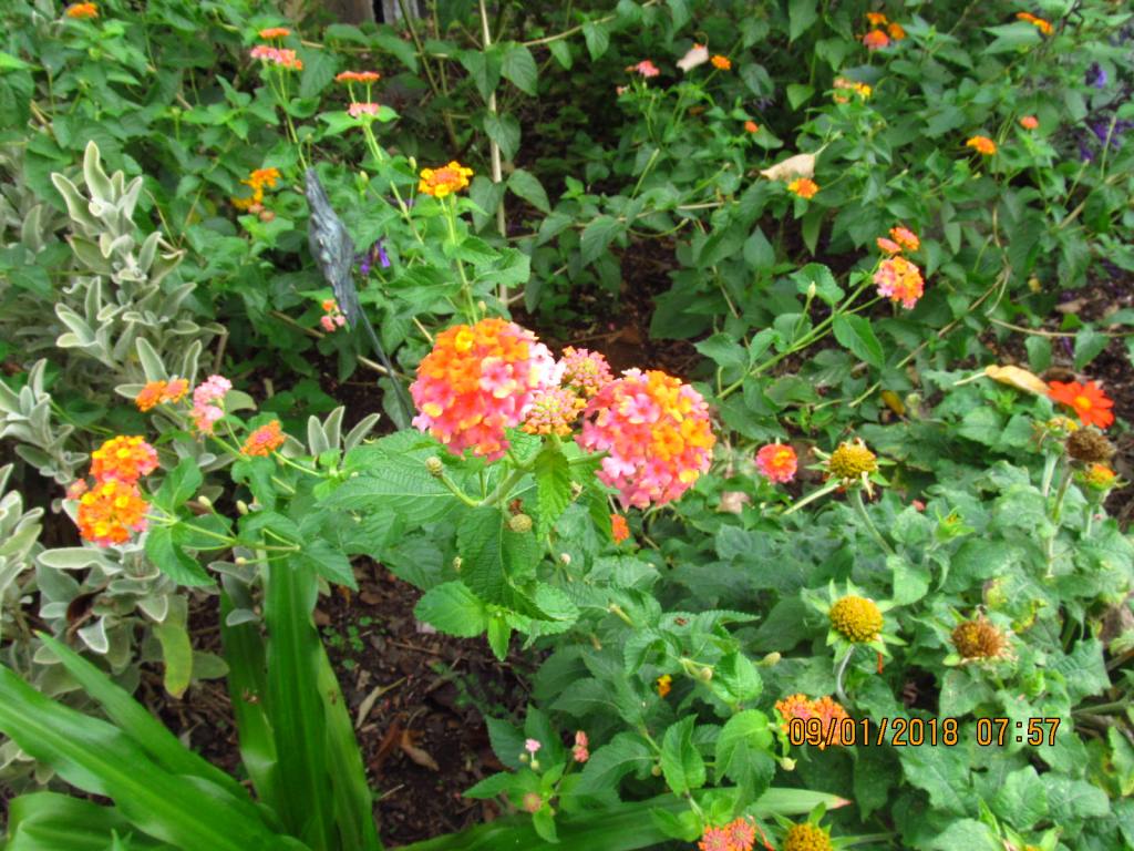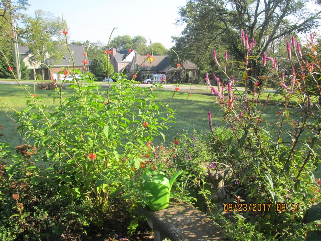 Miss Huff combines all my favorite sunset colors, and she will help me rout the excess pink I have in too many places. The pink Fireworks gomphrena, asters, and phlox can stay, but the pink cleome will not be invited back. Not just because they are pink, but because they shrivel in August and look awful. Exception will be made for the Coral Porterweed, native to Jamaica, shown here on the left in the Nashville garden-
