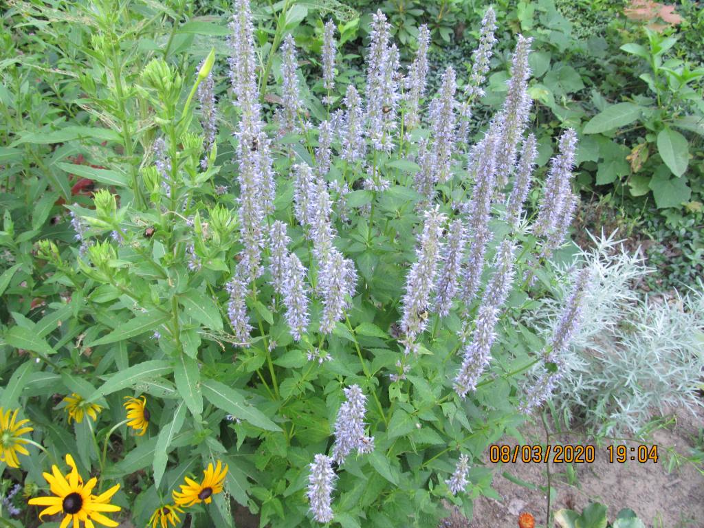 Above is Agastache “Blue Fortune”, a bee plant that grows in sand and never wilts. On the right is what I believe is Silver Queen artemesia. I found it growing in the lawn down back. It is another Never Wilter, very useful, since we are in a drought and the pond behind the dam is now half mud flat.