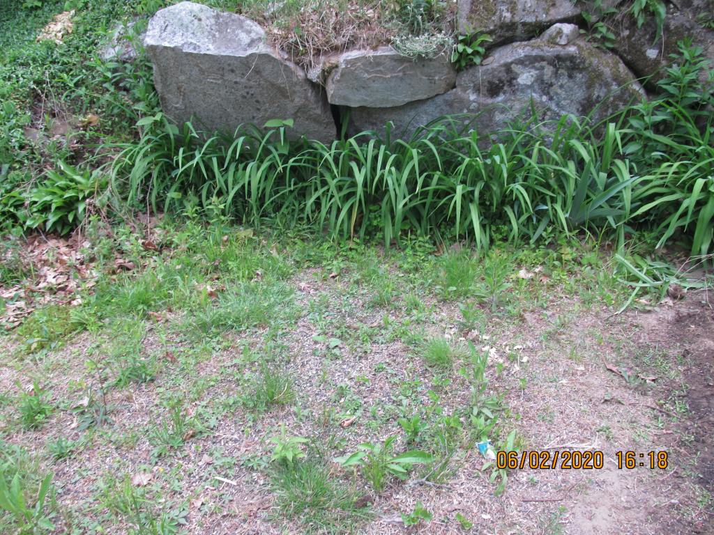 This photo is of the lawn in front of a granite retaining wall. Feral daylilies hug the wall base because the foot of a wall is a moister place to be. Not one tuber tries to venture out.