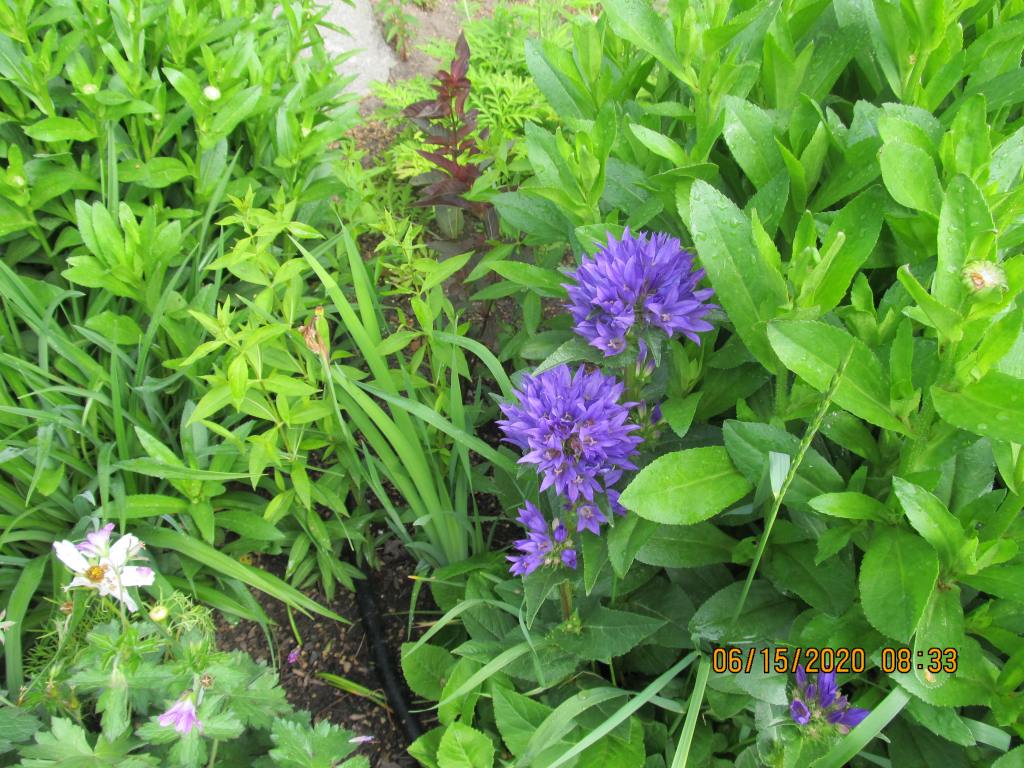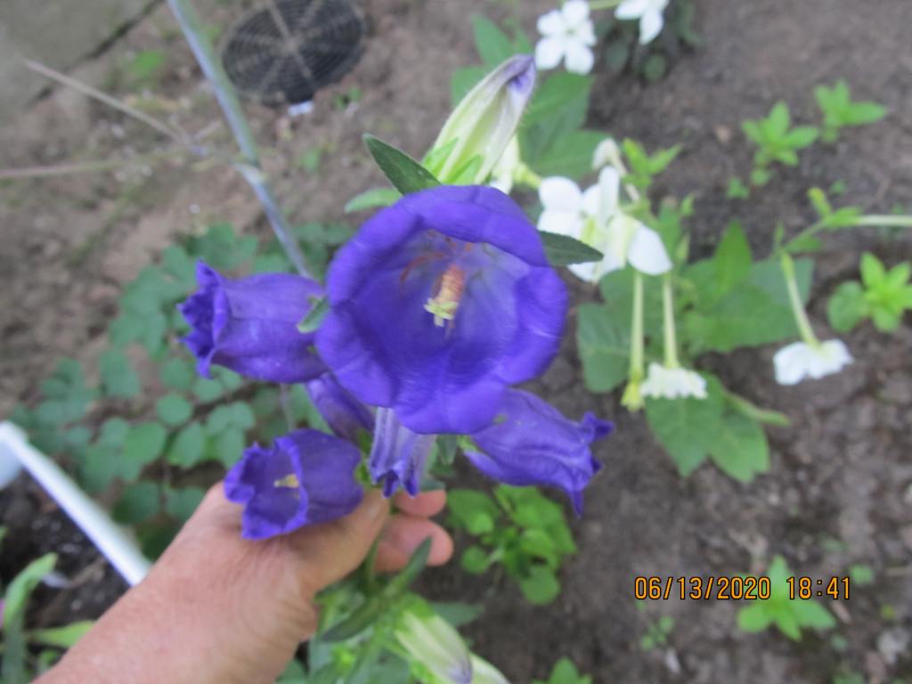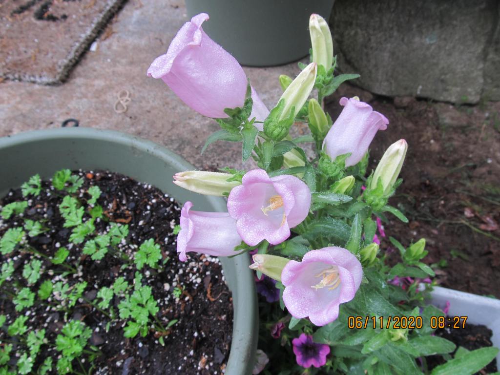 Lastly- a flower I have never grown before and have only seen in English garden picture books. Canterbury Bells, a biennial I found at Goffstown Ace Hardware. This is the pink one. The blue is not open yet. I put it in a container and not in the garden bed because it dies after bloom and would leave blank dirt that I would have to scramble to patch.