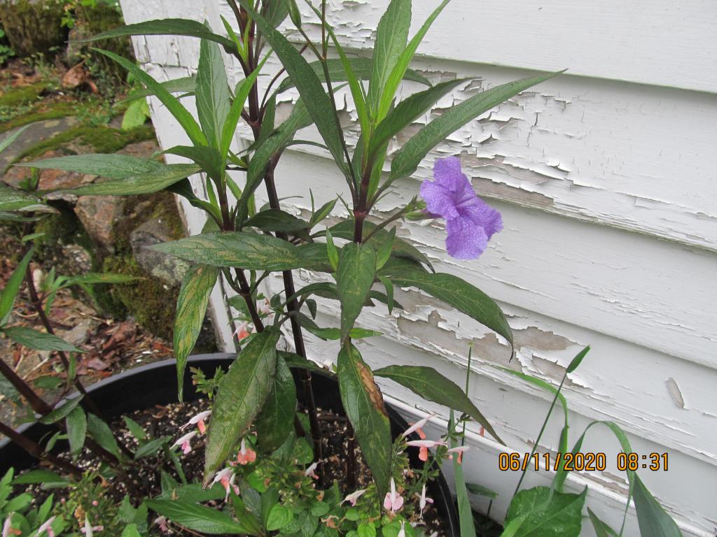 Tough, and in bloom most days is the Mexican Petunia,Ruellia brittoniana. Cuttings root easily in water. Here it is in a pot.