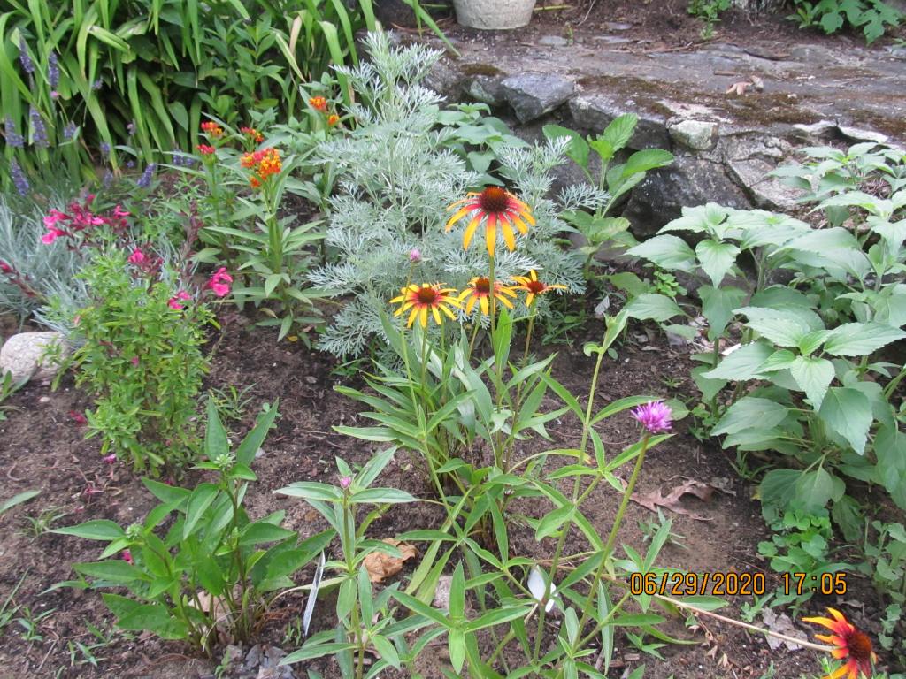Russian sages, globe thistles, white perennial scabious, Clary sage, Silver King artemesia, “Fireworks” gomphrena-