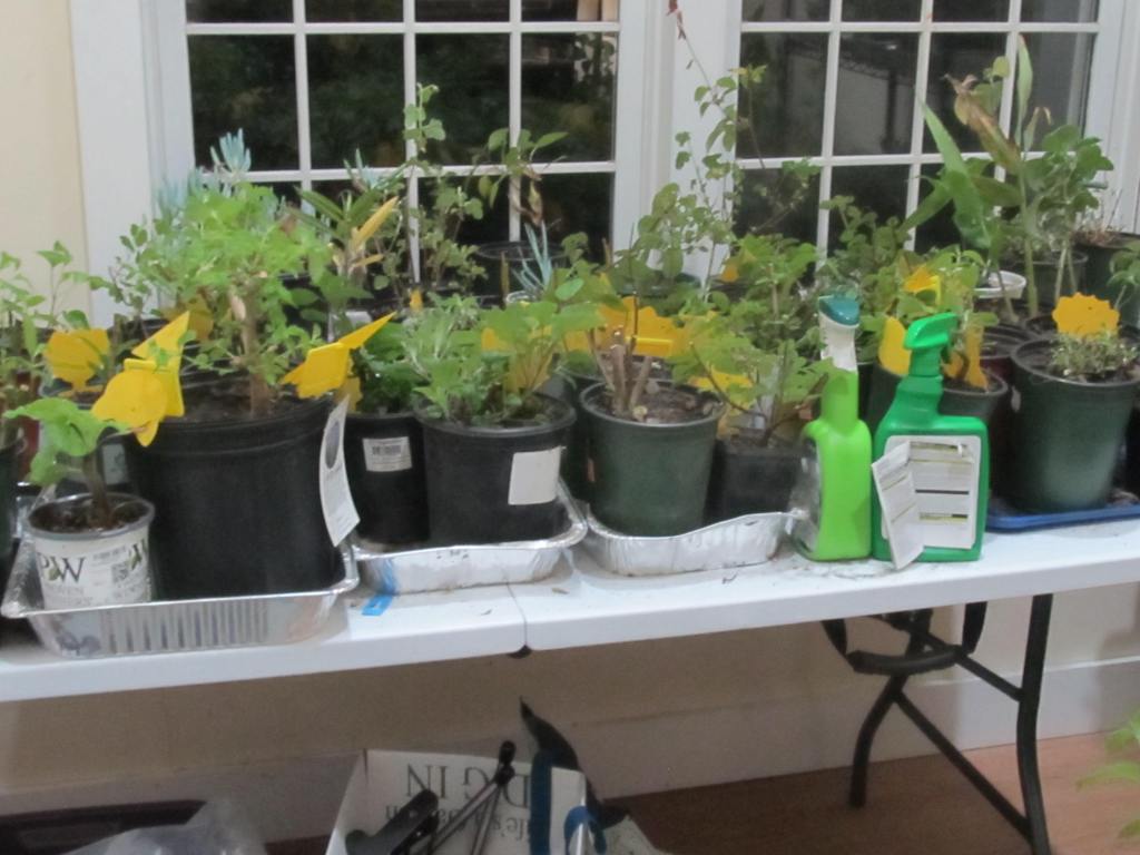 Above is a sunny window facing southwest. The yellow tags are sticky traps for whiteflies, which can shrivel leaves and discourage a plant to death. The spray bottles are Neem Oil and insecticidal soap, used on aphids. There are many pots of special lantanas in this room, and they are loved by whiteflies, although they are not as damaged by the flies as the tender salvias are.