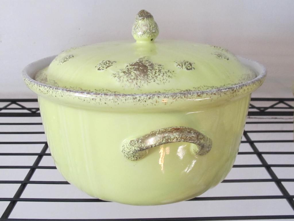 Below are vintage Hall Pottery casseroles from the 50s, I believe. I looked on Ebay and Etsy recently and saw that this elegant series of this pottery were nowhere to be seen. All for sale now seem to be muddy colored teapots and casseroles. I wonder if the older gold leaf pottery went out of favor because it cannot go in a microwave or a dishwasher. Convenience is King now.