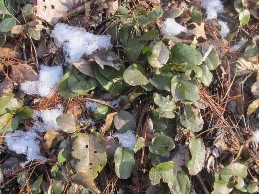 And below, a photo of the leathery creeping leaves of the beloved New England wildflower Trailing Arbutus, fragrant and blooming in April on the field edges of the Oak and Pine forest.