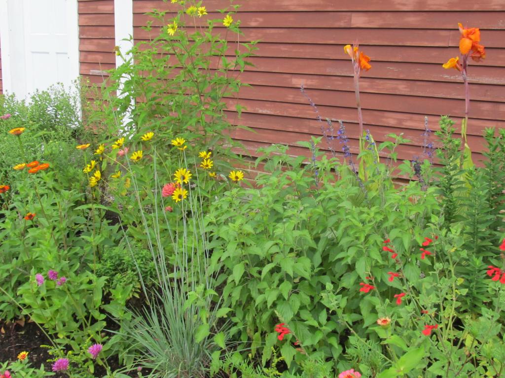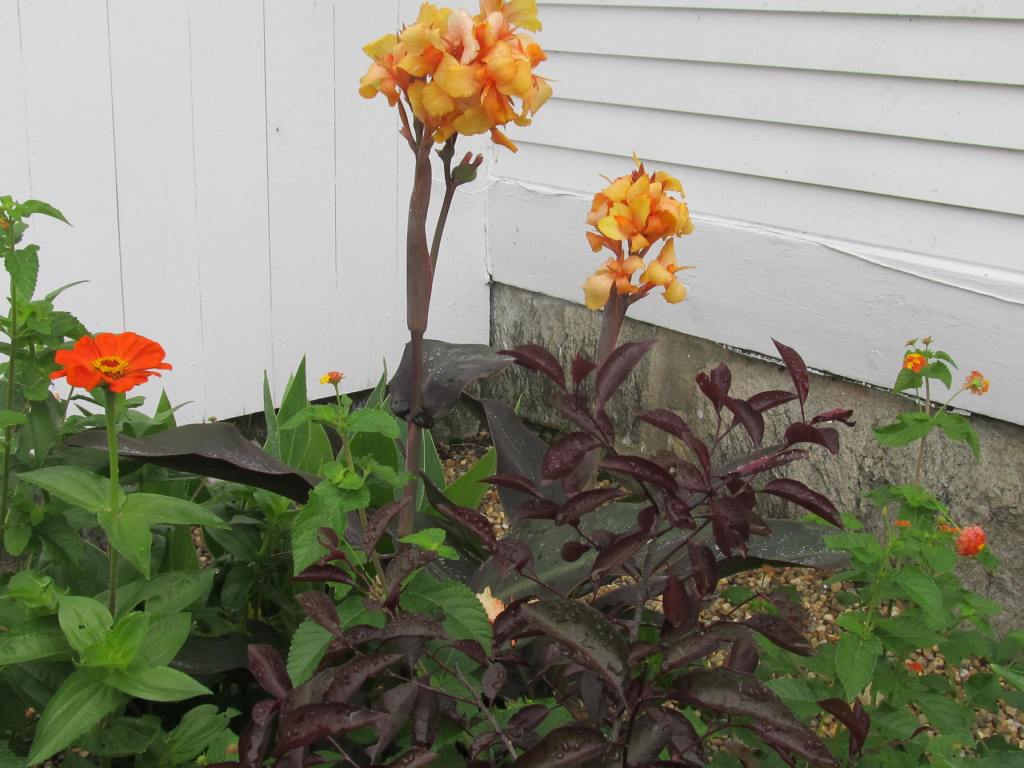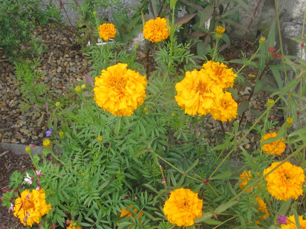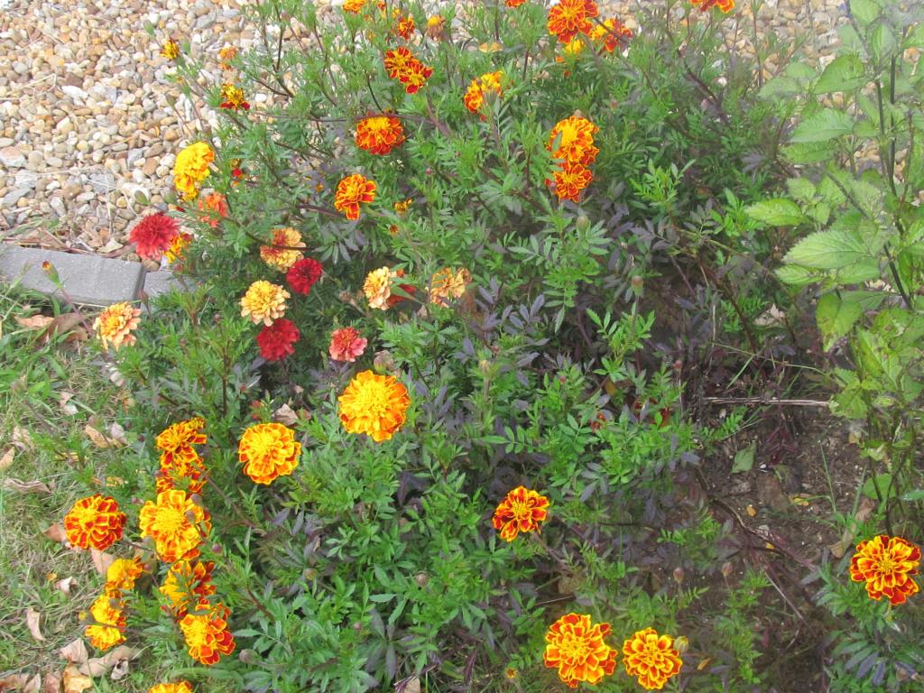 The bonfire colors of French marigolds, and below the African marigold “Crackerjack”. The small French marigolds bloom early and all summer, but the seed raised Africans start blooming so late that next season I will start them under lights.