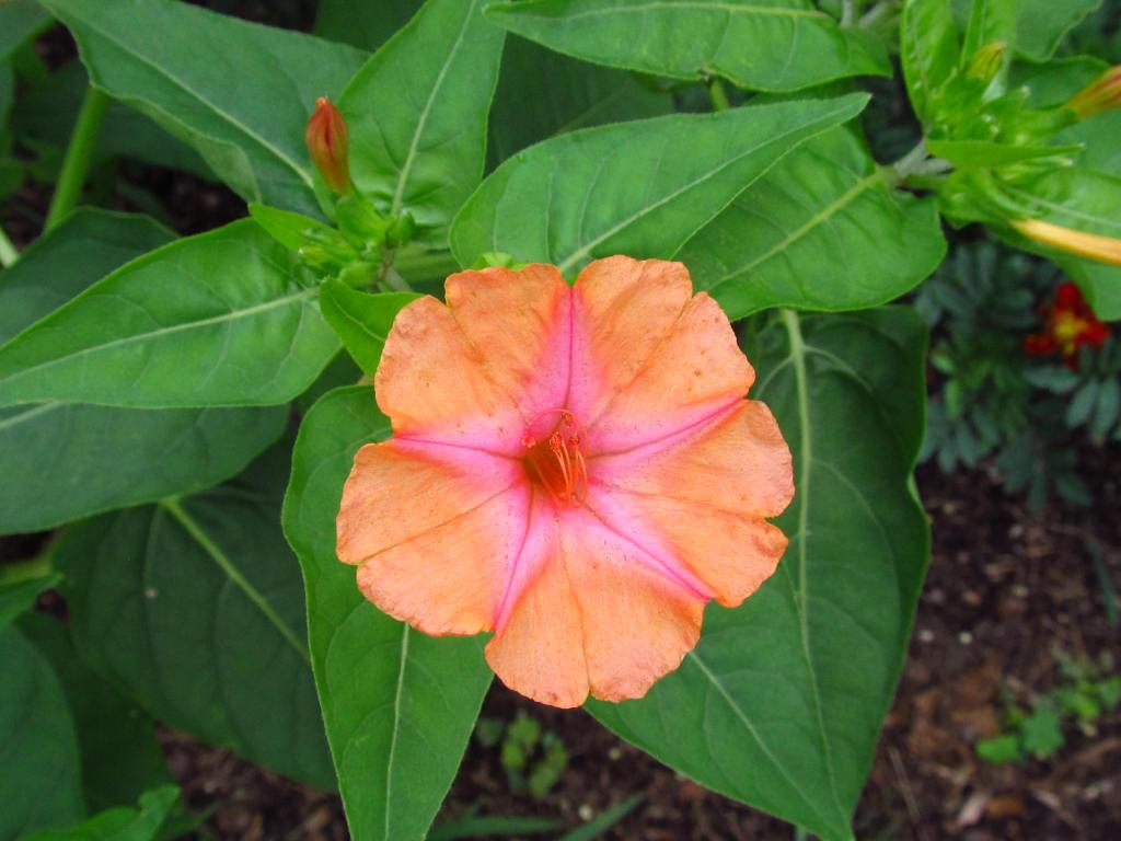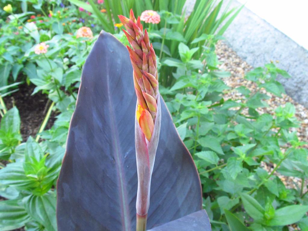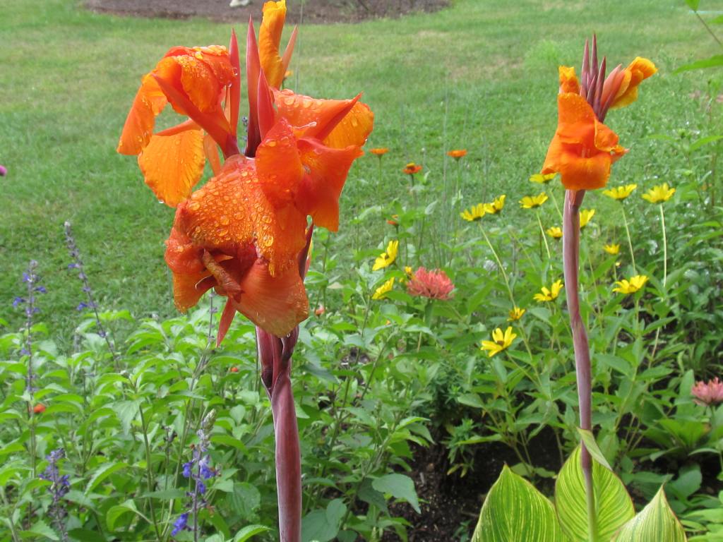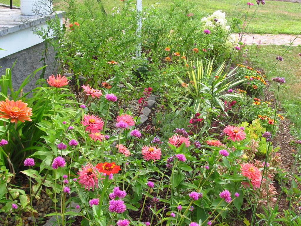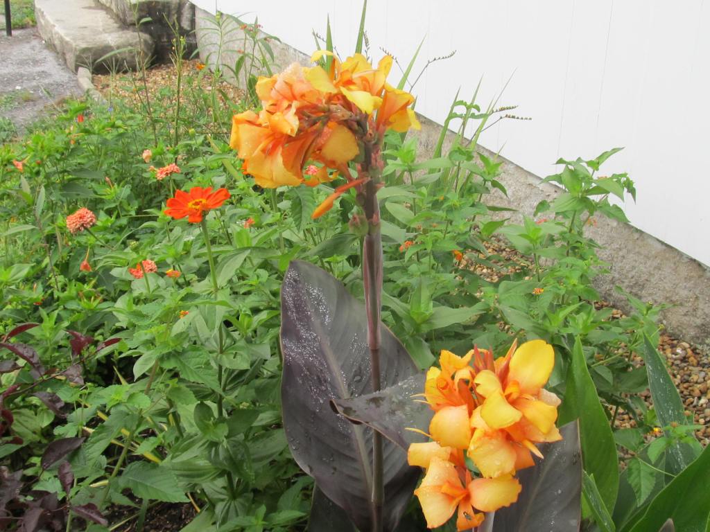 The bonfire colors of French marigolds, and below the African marigold “Crackerjack”. The small French marigolds bloom early and all summer, but the seed raised Africans start blooming so late that next season I will start them under lights.