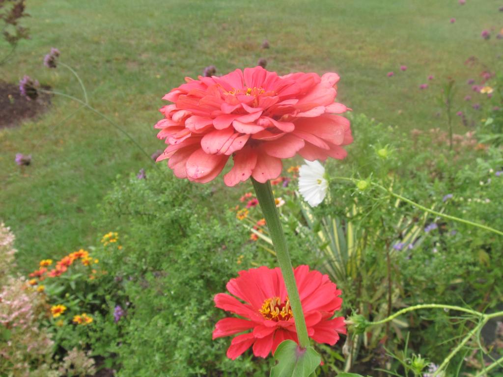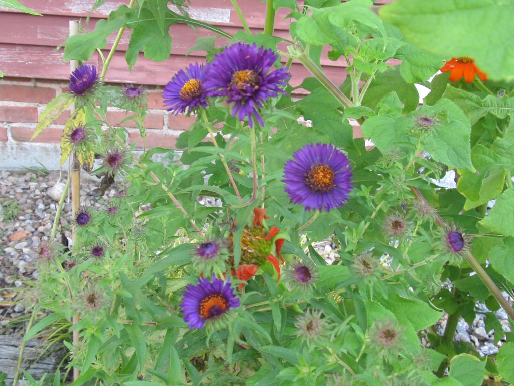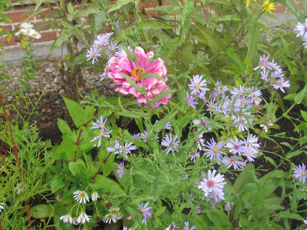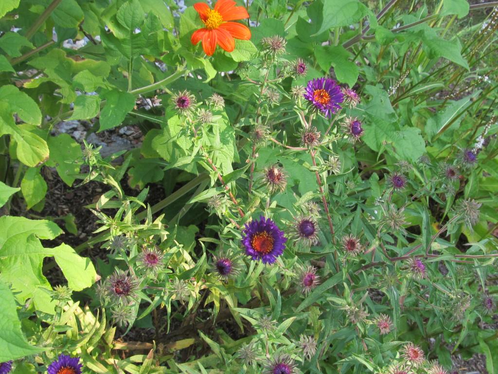 Above are Aster laevis “Bluebird” and a lone zinnia with a rose-like bloom. “Bluebird” has succulent leaves and is tolerant of sandy dry soil.