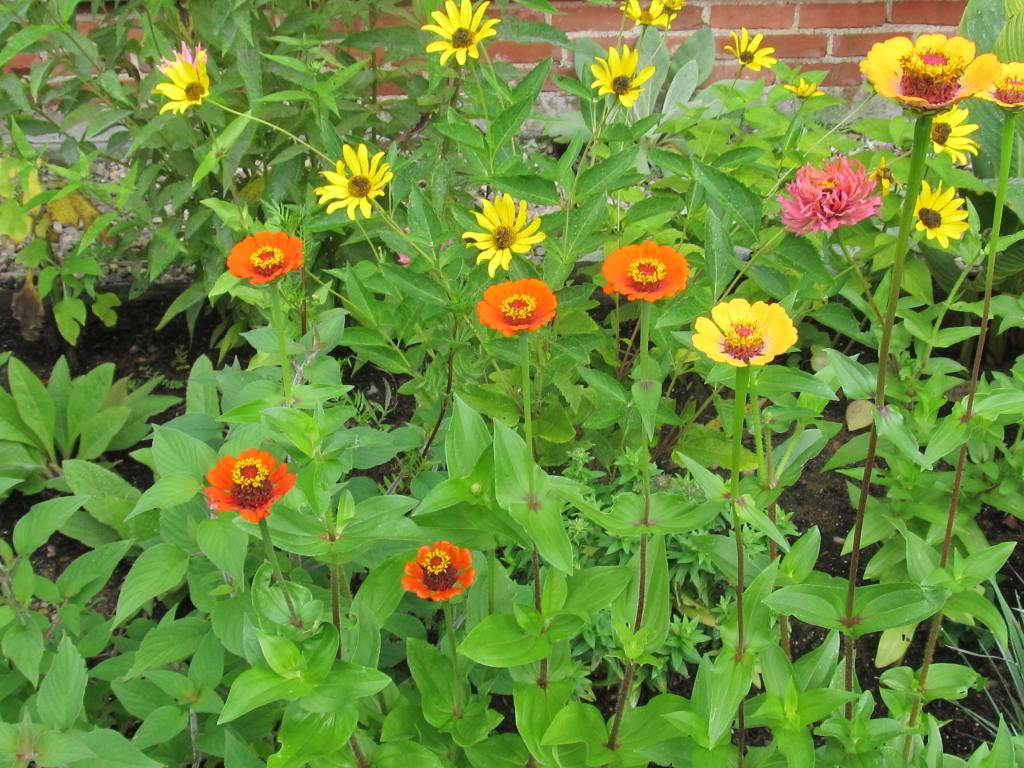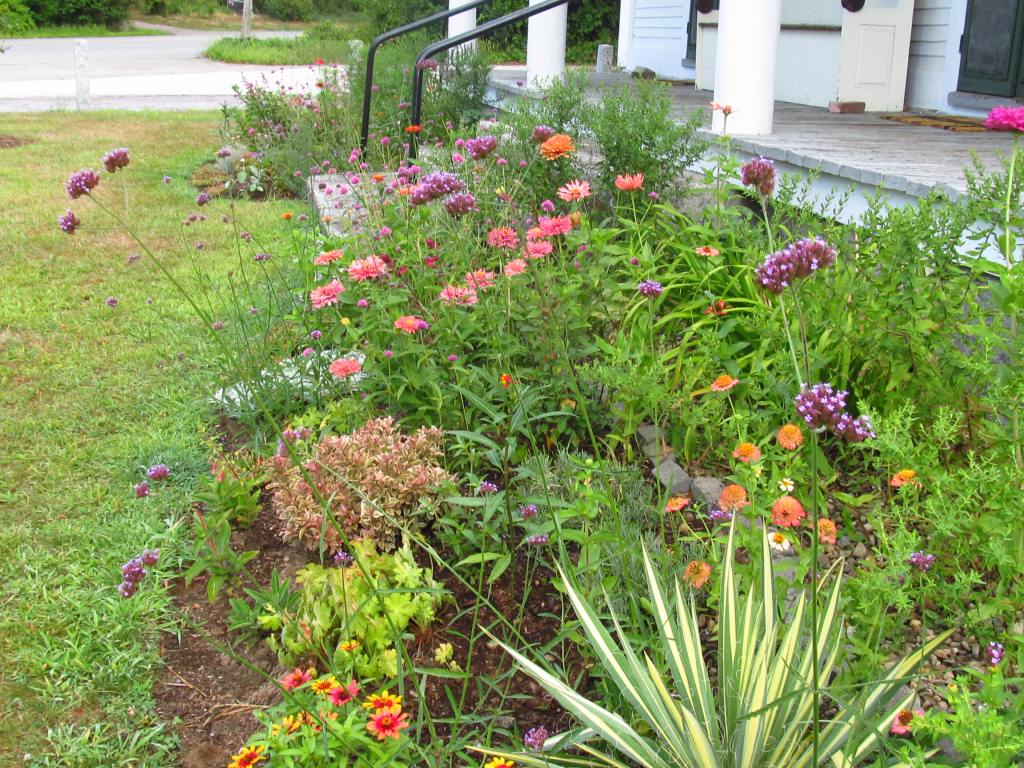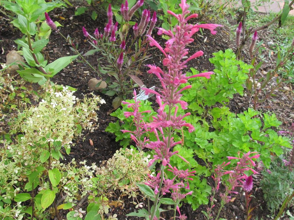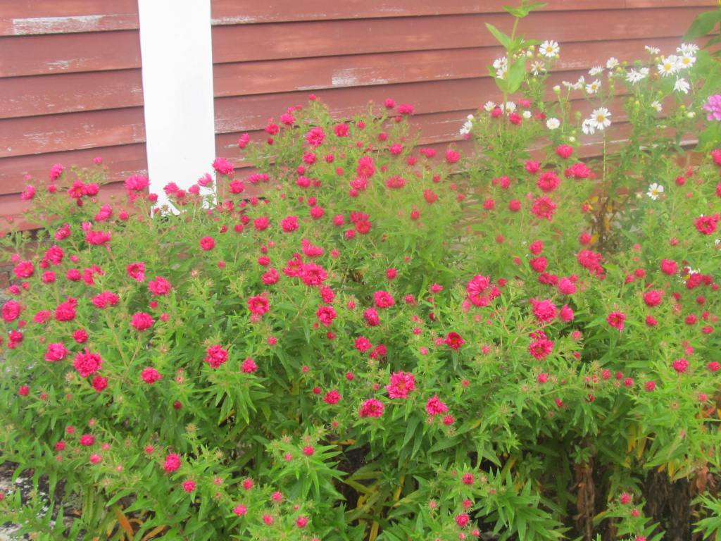 Above are Aster laevis “Bluebird” and a lone zinnia with a rose-like bloom. “Bluebird” has succulent leaves and is tolerant of sandy dry soil.