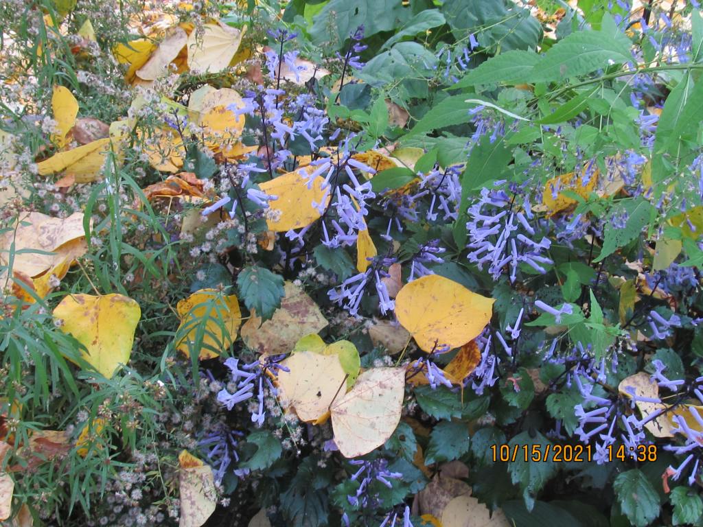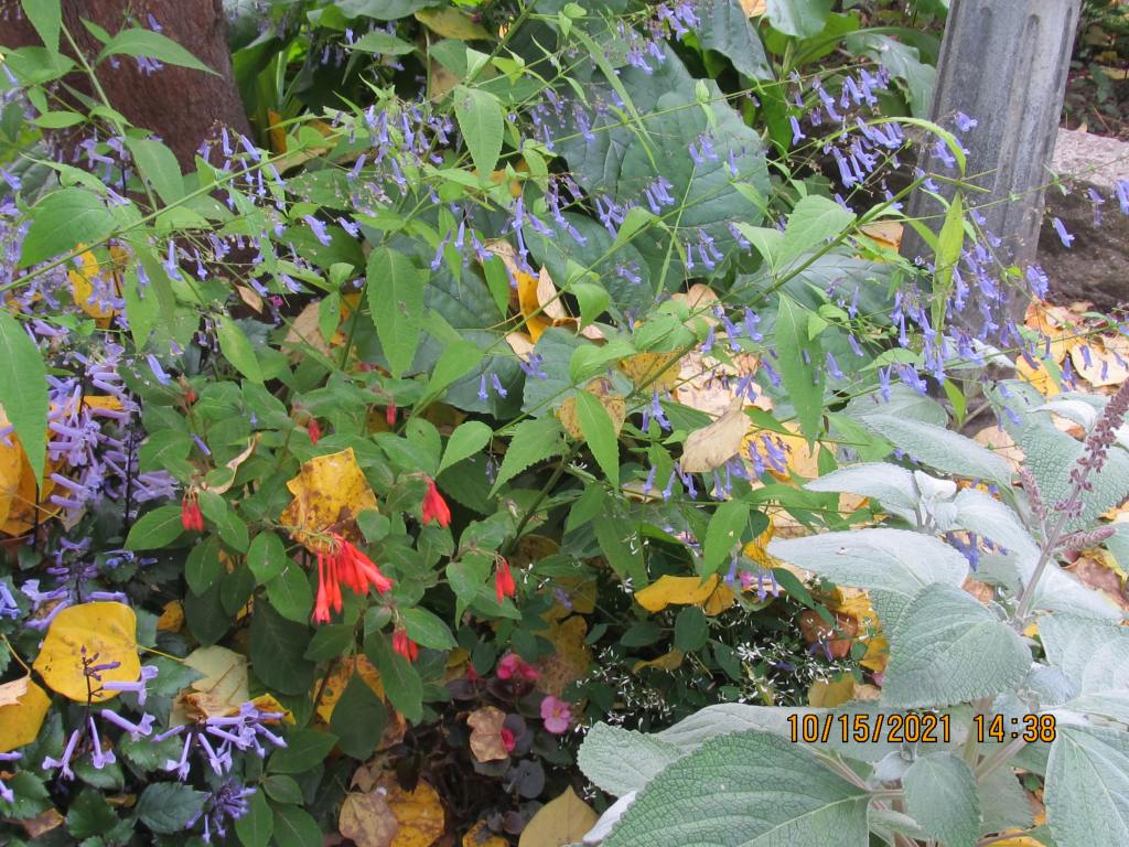 Redbud leaves on Plectranthus “Velvet Elvis”Old timey hardy chrysanthemum -Bow gardenHardy Autumn salvia “Monobana”