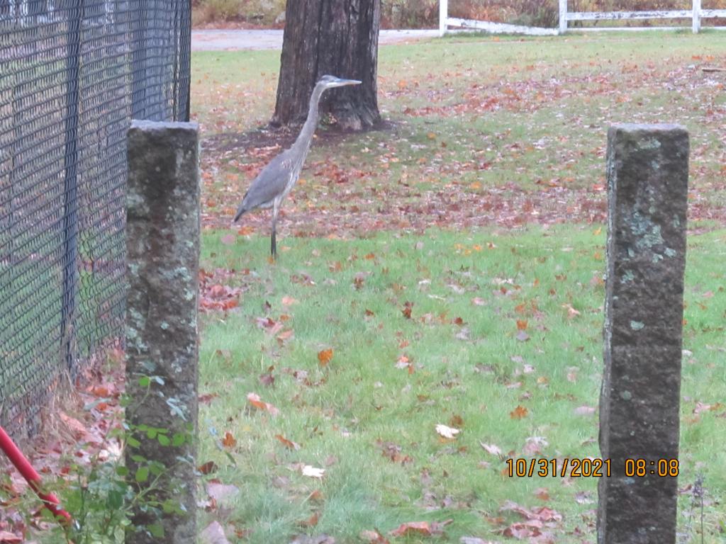 Heavy rain over the last few days has made the river rise and Gregg Mill Pond swell. The fish must be too deep, and fishing too hazardous, for after I filled the courtyard bird feeders this morning, and the squirrel and chipmunk mob came running, this hunter came stalking into the yard. Perhaps he thought he could freeze and pretend he was a granite post, hoping a squirrel would not notice-